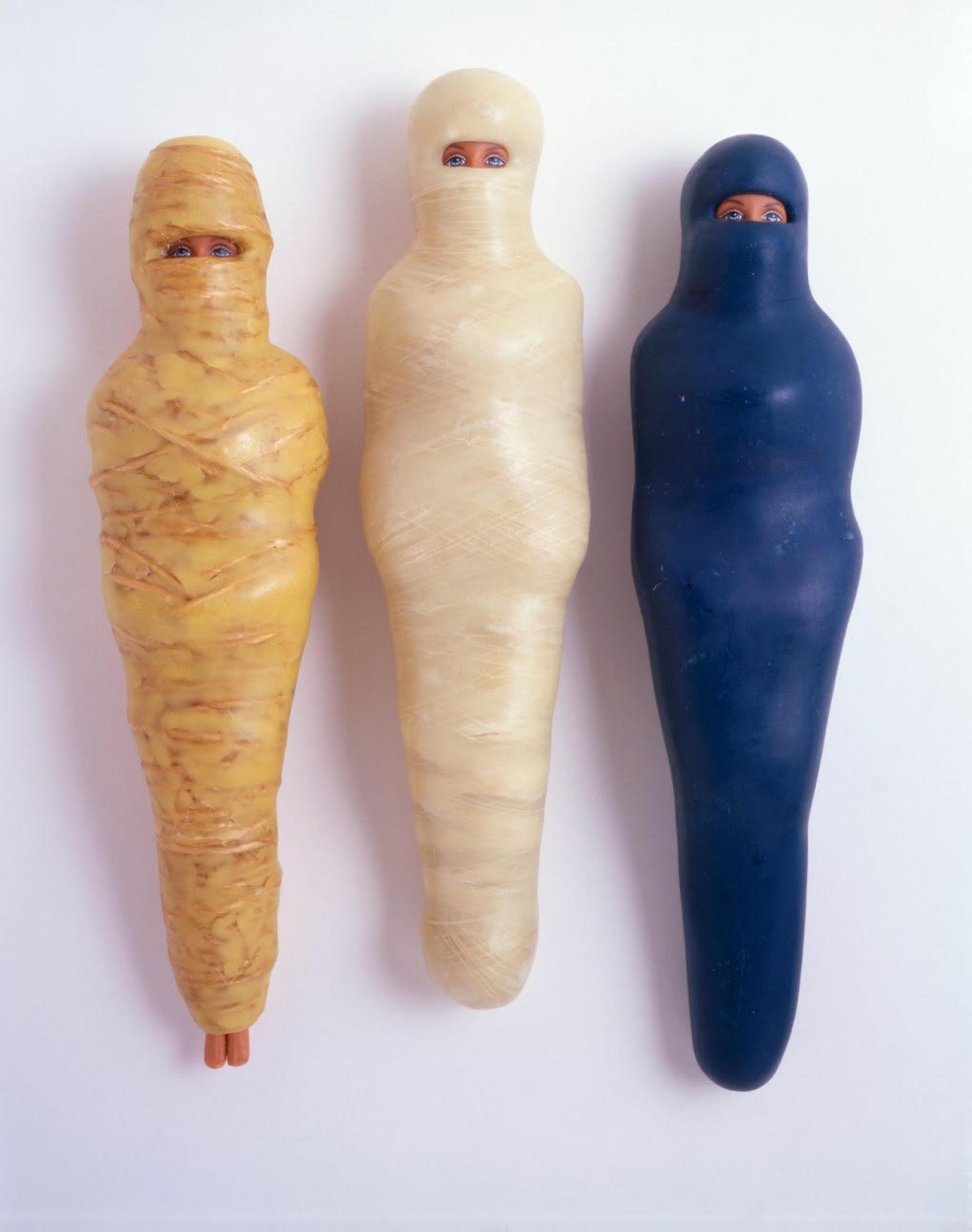 与南希·博森的《老年芭比》一样,艺术家E.V.戴(E.V.Day)也探索了芭比永恒青春的观念。自2001年以来,戴创作了一系列名为《木乃伊芭比》的作品,她将其视为西方社会对女性痴迷的一种评论,女性被夸大和性感化到了幻想的地步。通过遮盖芭比的身体,戴希望将芭比与维纳斯、阿芙罗狄蒂等一系列神话女性比较。在此,包裹在闪闪发光的亚麻布和蜜蜡中的芭比,成为古代遗迹的另一种形式,在当代社会被去人性化并展示。