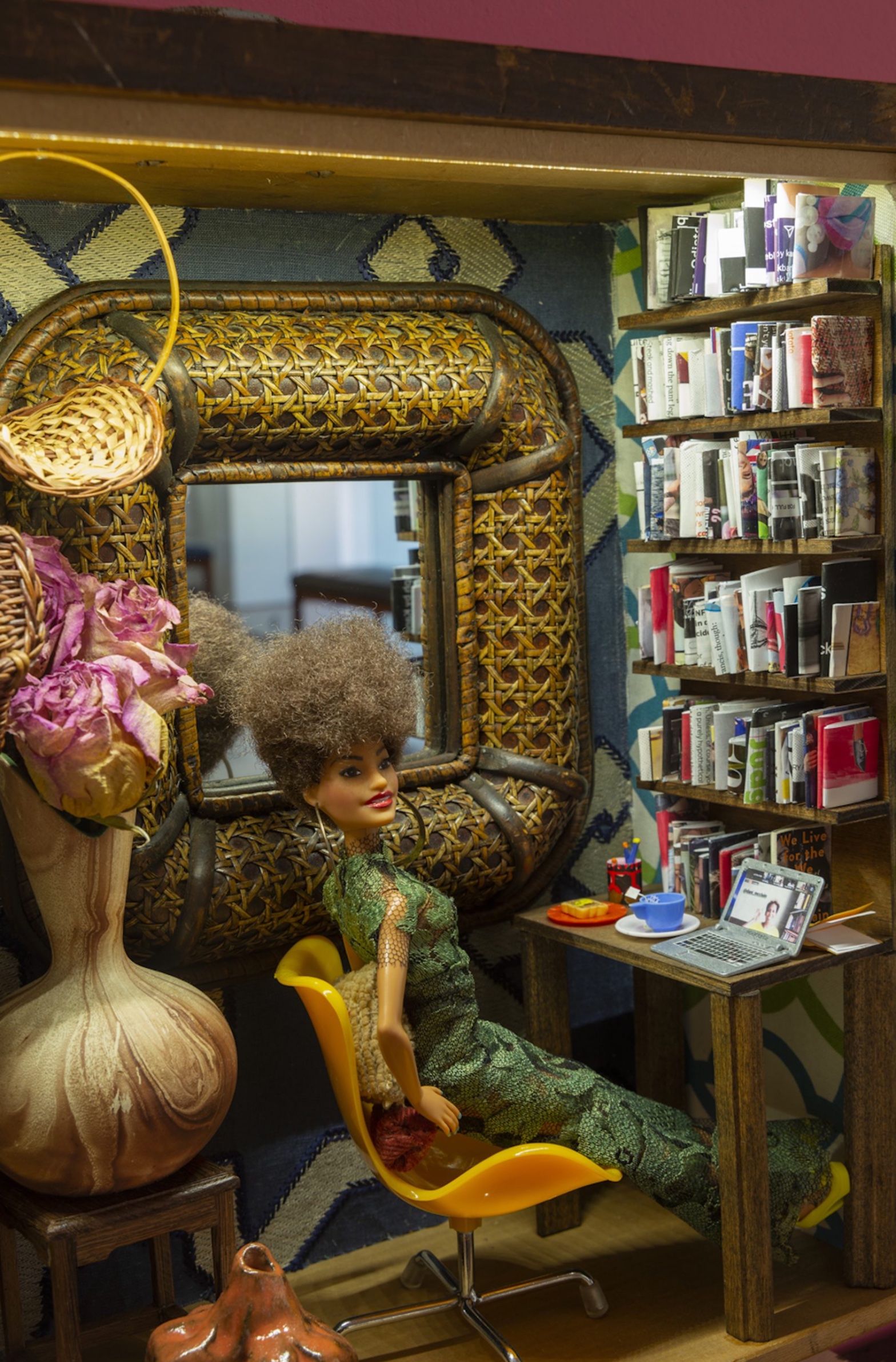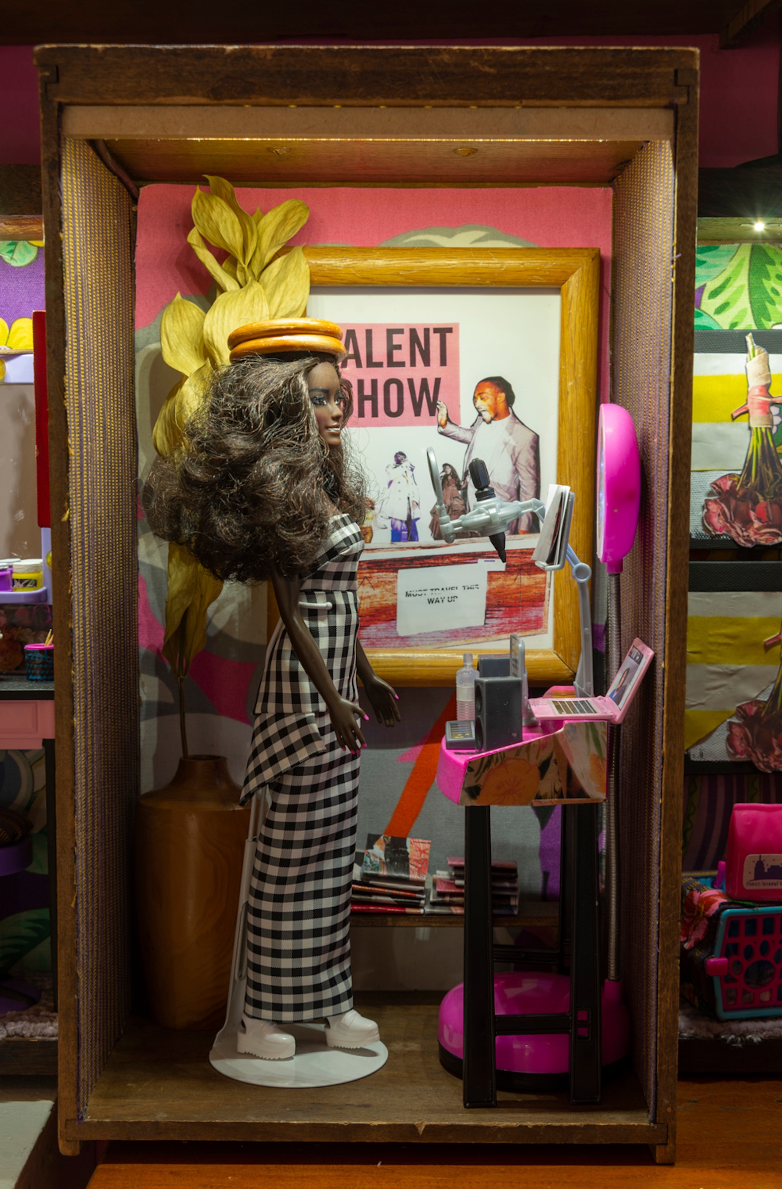 在《配音女王(托里·威尔金斯)》(2021)中,一只芭比娃娃似乎正在直播,她的脸被直播的环形灯光照亮。该展览还引起了公众对黑肤色玩偶相对缺乏的关注,贝蒂耶·萨尔(BetyeSaar)2021年题为“黑色玩偶布鲁斯”(BlackDollBlues)的展览也探讨了这一想法。
