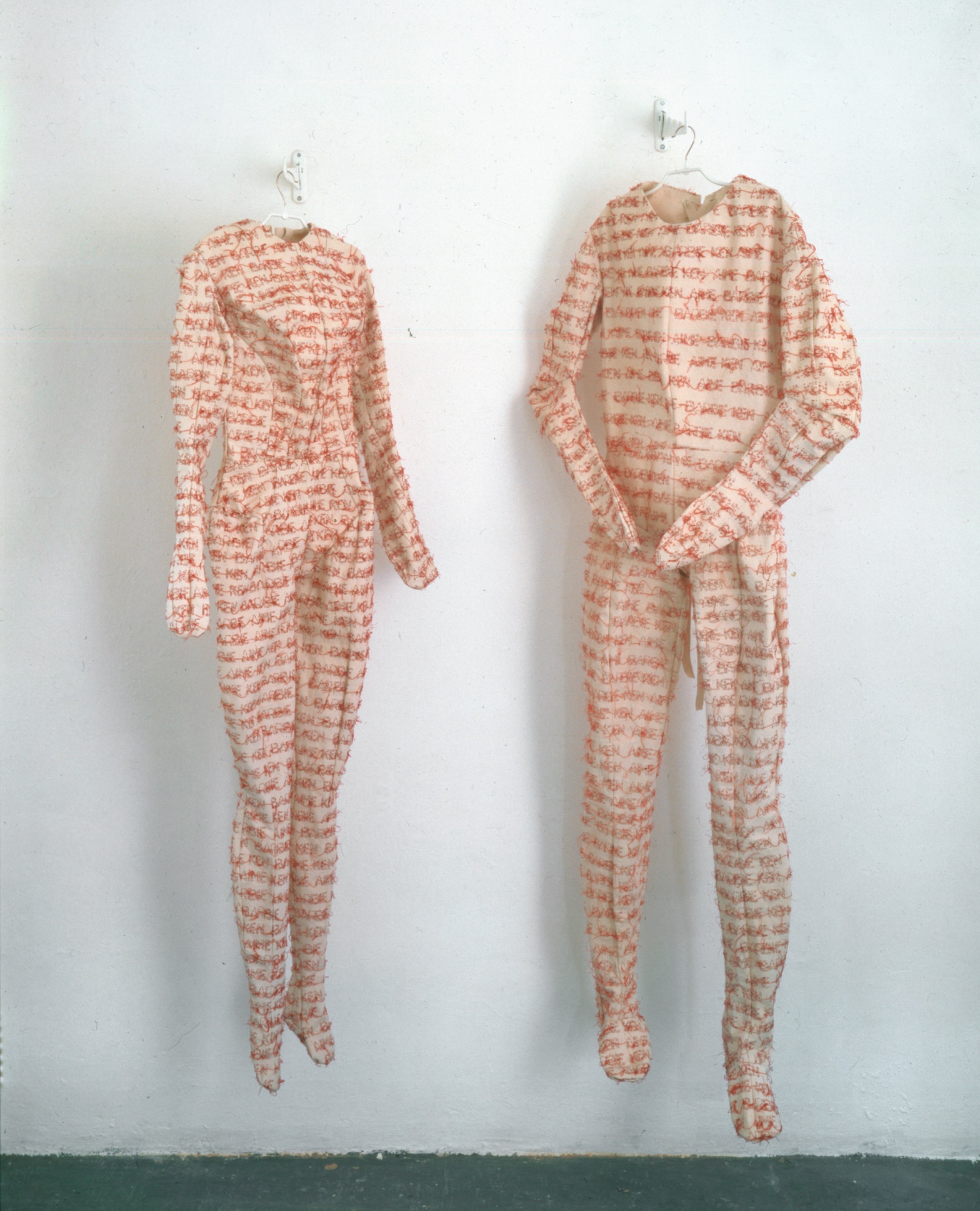 艺术家加达·阿默(GhadaAmer)2004年的作品《芭比爱肯,肯爱芭比》(BarbieLovesKen,KenLovesBarbie)是两套印有作品名的连体衣,虽然连体衣模糊了性别,但它们的归属却显而易见。阿默把芭比的身体比例转移到了她的服装上,体现了她身体的夸张比例。