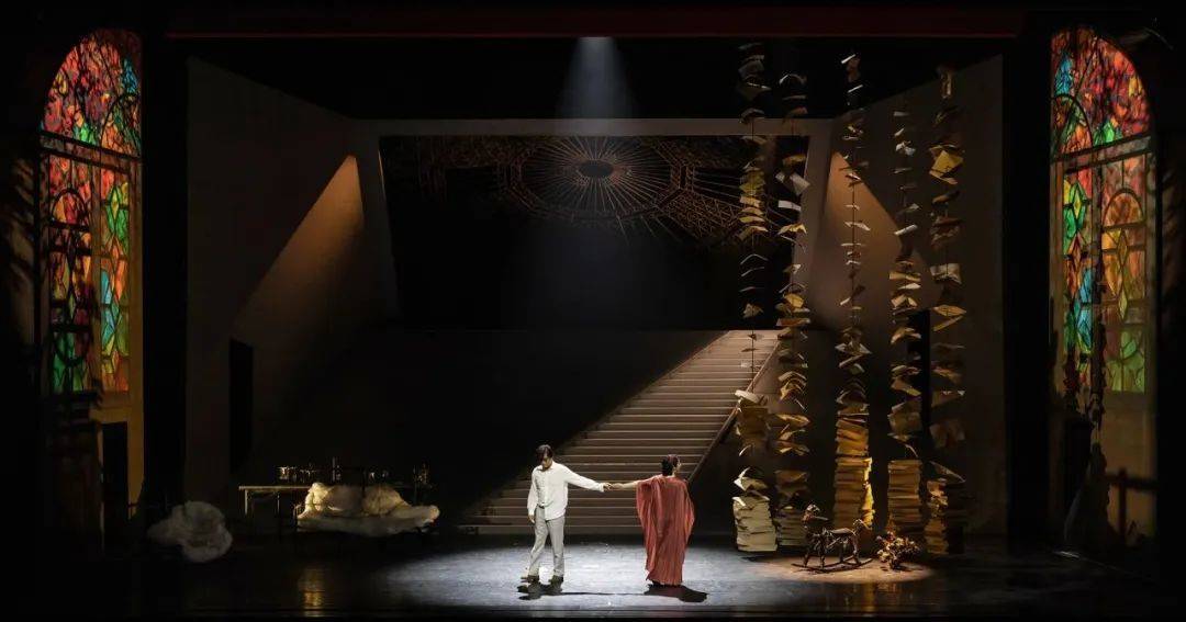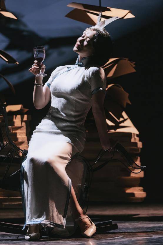 高级,是金星一直追求的舞台呈现效果。比如在舞美设计上,“陈白露”坐在摇摇欲坠的木马上,四周悬挂而起的是如山的书卷与账本。正如她飘摇无根基的生活,被象征天真理想的书卷和指向残酷现实的账本重重包围,窒息而无望。而在陈白露身后,斜立的台阶与两侧的光滑坡面,倾斜而上,直抵天幕。“现代舞和戏剧表演多半在坡面上完成,这对于演员来说,本身存在技术性的挑战。但也恰好暗喻着剧中人举步维艰的生存处境。而在通向天际的台阶上,拾阶而上或顺势而下的,也都是漫漫人生。”金星解释道。