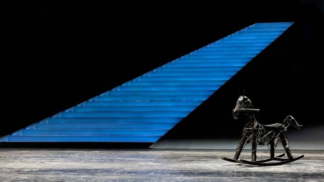 “太阳升起来了,黑暗留在后面,可是太阳不是我们的,我们要睡了。”舞台上,眼神充满悲伤与绝望的陈白露头微微上扬,用哽咽的声音,重复着这句台词。缓缓踱步,手中的纸片纷纷落地,而后,她走上身后的长梯,摇摇晃晃的小木马在舞台上显得更加孤零零。