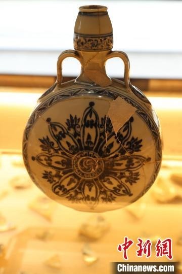 6月19日,江西景德镇御窑博物馆内展示的青花伊斯兰式轮花纹绶带耳葫芦扁瓶修复件。 中新社记者刘力鑫摄