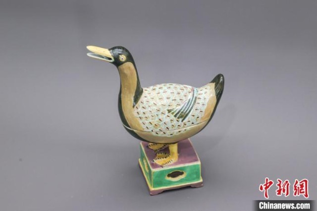 6月19日,江西景德镇御窑博物院内修复好的明成化素三彩鸭型香薰。 中新社记者刘力鑫摄