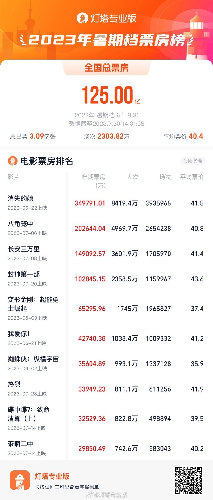 据灯塔专业版实时数据,截至7月30日14时31分,2023年暑期档(6月1日-8月31日)总票房(含预售)突破125亿元。