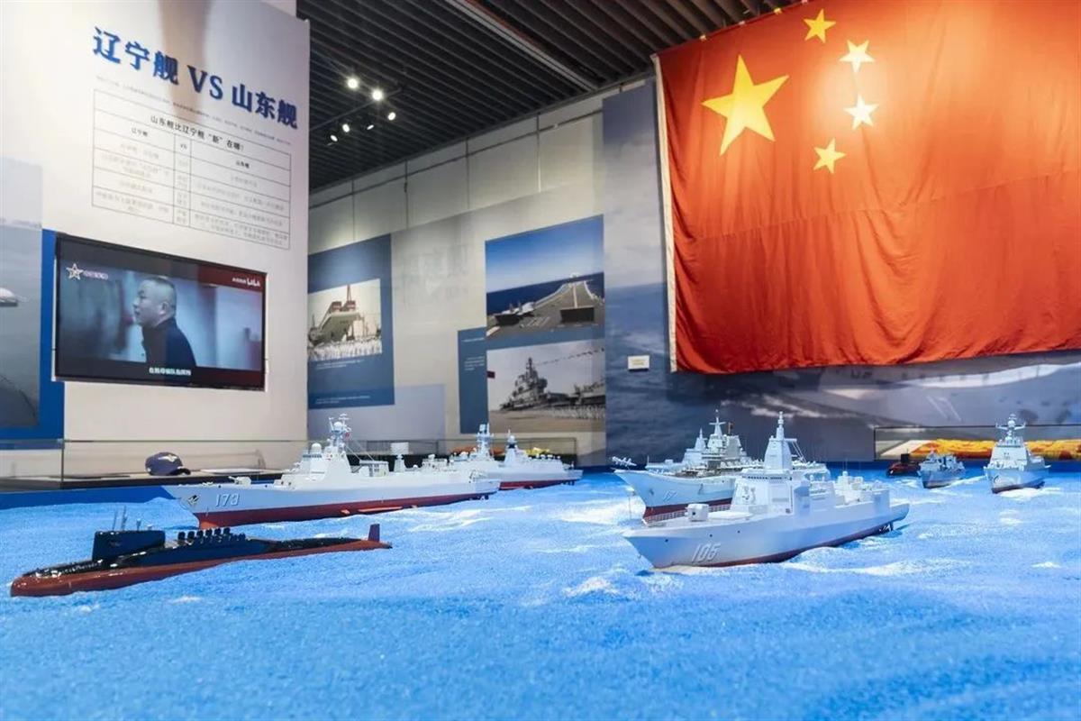 展览围绕“魂归黄海——致远舰”“血染长江——中山舰”“向海图强——长江舰”“走向深蓝——山东舰”四大部分展开,结合图片、文字、文物、舰模、多媒体等形式,以舰说史,以物证史。