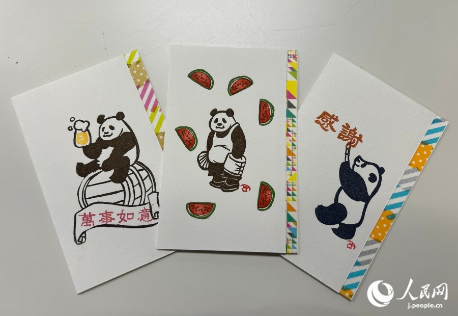 图为丁未堂创作的熊猫系列明信片。人民网玄番登史江摄
