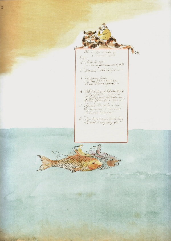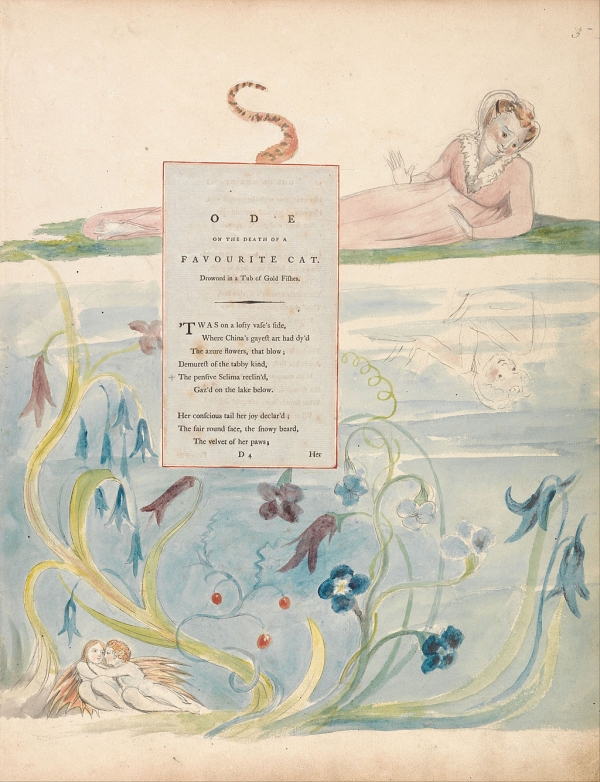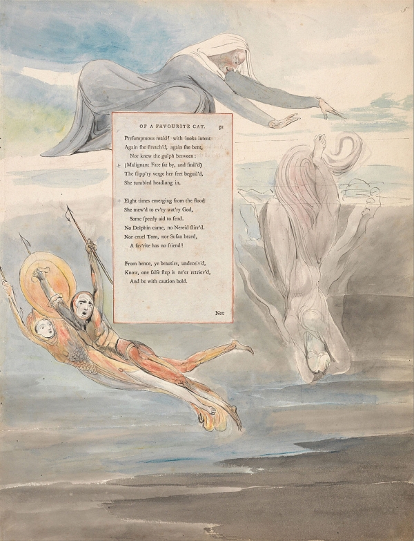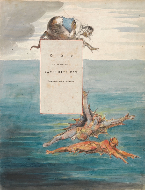 在18世纪的诗歌、绘画中,猫作为宠物的地位日益突出。1747年,英国新古典主义诗人托马斯·格雷(ThomasGray)创作了《写给溺死在金鱼瓷瓶中的爱猫的挽歌》,缅怀朋友意外身亡的爱猫。大约50年后,英国画家威廉·布莱克在1797年间为这首诗歌绘制了116幅水彩插画(图10-14)。