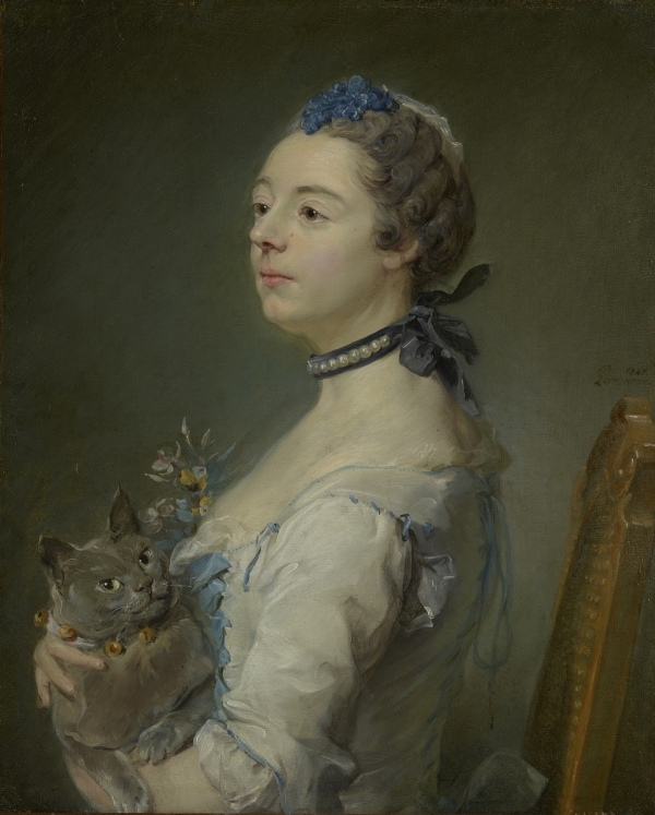 猫作为人类的新宠和它对人类的不服从也体现在法国画家让-巴蒂斯特·佩罗诺(Jean-BaptistePerronneau)为玛格达琳·平塞卢·德拉·格兰奇(MagdaleinePinceloupdelaGrange)夫人画的肖像画(图4)中。这位贵妇人来自一个纺织业家族,该家族专门生产平纹奶酪布。大概因为产业涉及外贸,他们有机会接触到动物交易商,所以才获得这只在当时特别稀有的大蓝猫。格兰奇夫人非常喜欢她的宠物猫,要把它画进肖像里。但画猫可不是一件容易的事情,画中,猫的四肢、颈部和头部都呈现出紧张感,表明它不喜欢被抱。同时,格兰奇夫人笔直地坐着,背部并未接触身后的椅子,一副不自然的模样。她大概在竭力不让猫咪从她的怀中溜掉。猫项圈上的金色铃铛与夫人脖子上的珍珠项链遥相呼应,暗示猫和主人同样雍容华贵。这幅画表明,猫已经融入人类社会,但它依然保有独立性。这幅画同时表明:人类正和猫“斗智斗勇”,比如给猫戴铃铛,这样做既起到一定的装饰作用,又可以阻止猫狩猎的本性有可能带来的麻烦。