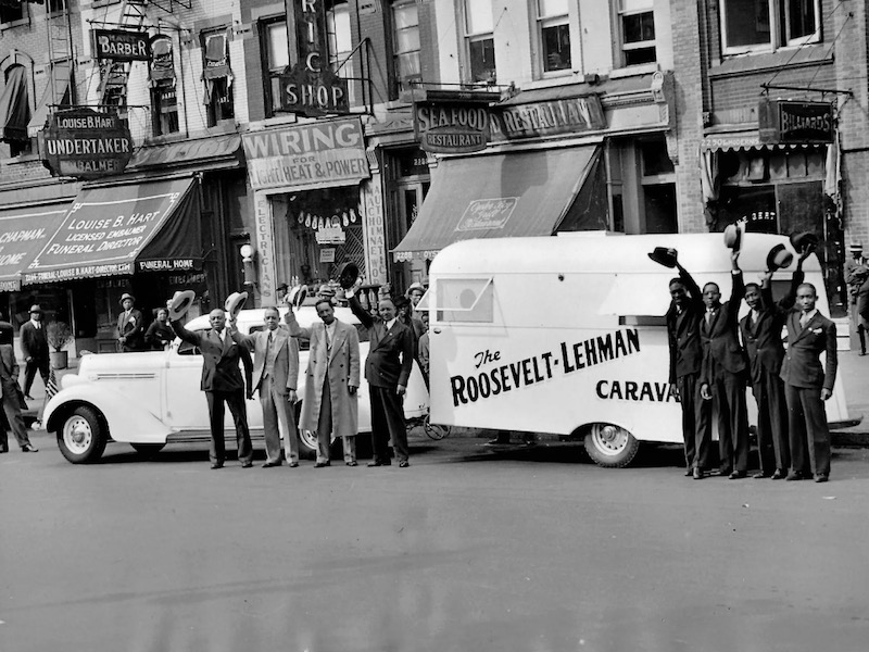 1936年10月,罗斯福的黑人支持者离开哈莱姆区,前往纽约州各地开展竞选活动。在当年的总统竞选中,许多黑人选民转向民主党。