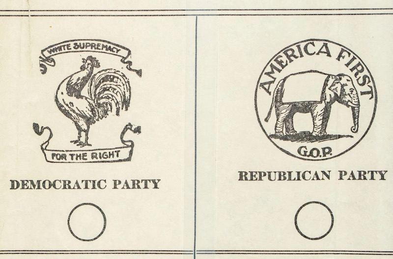 选票细节,显示了州民主党的徽章,其中包含“白人至上”字样