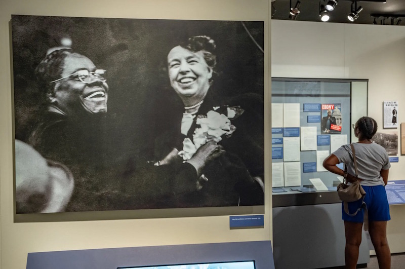 展览现场,展示埃莉诺-罗斯福与富兰克林-罗斯福的非正式“黑人内阁”成员、亲密盟友玛丽·麦克莱奥德·白求恩的合影