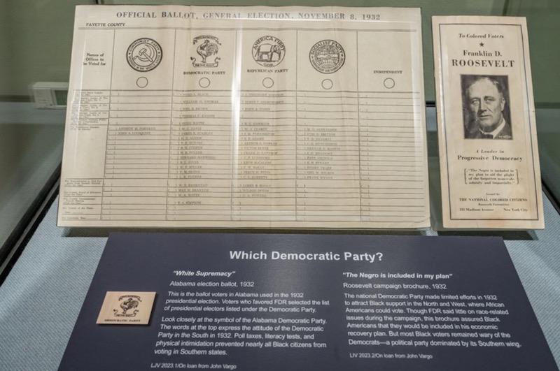 在入口处的放大照片显示,1933年5月,黑人游行人员在白宫外,举着要求“黑人完全平等!”的标语牌。在拐角处,你可以看到罗斯福。他在1932年民主党全国代表大会上发表了讲话,而墙上的文字说明,提名他的代表都是白人。旁边是一张1932年阿拉巴马州的选票,上面有该州民主党的徽章:一只公鸡站在“白人至上”的字样下。同时,展墙上的文字标题明确提出了中心问题:“所有美国人的新政?”