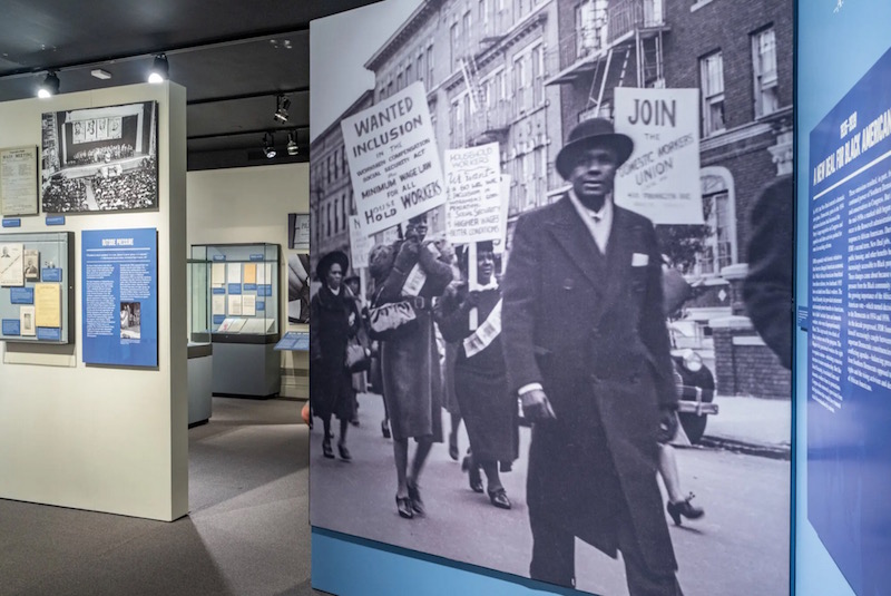 在谈及新政最大的项目——社会保障时,展览复杂化的是观众普遍认为的将农业工人和家庭佣工排除在外是出于种族动机。展墙上的文字说明,虽然从事这些工作的黑人比例过高,但将近75%被排除在外的工人是白人。