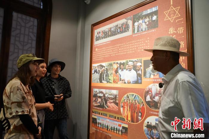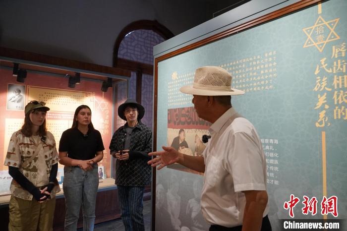 图为青海省海东市循化县撒拉族历史文化地标骆驼泉内,伊朗博主普雅(左三)、土库曼斯坦留学生唐一泓(左二)、法国博主乐盖曦(左一)参观当地撒拉族历史文化馆。马铭言摄