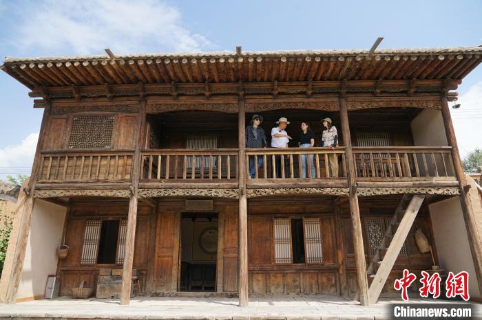 图为青海省海东市循化县撒拉族历史文化地标骆驼泉内,伊朗博主普雅(左一)、土库曼斯坦留学生唐一泓(右二)、法国博主乐盖曦(右一)聆听当地讲解员介绍撒拉族篱笆楼。马铭言摄