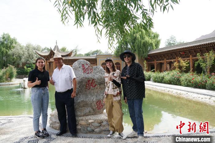 图为青海省海东市循化县撒拉族历史文化地标骆驼泉内,伊朗博主普雅(左)、土库曼斯坦留学生唐一泓(右)和当地讲解员进行交流。马铭言摄