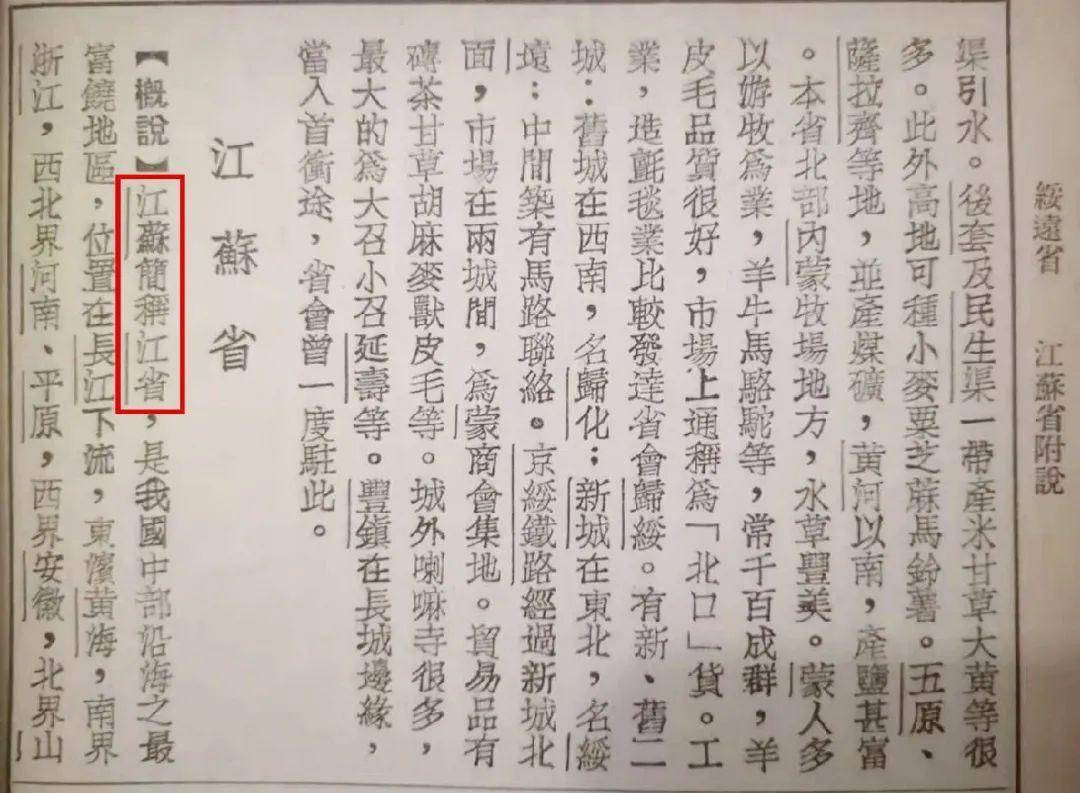 黄浪提及,“苏”并不是江苏历史上的唯一简称。清代黄钧宰《金壶浪墨》中称:“天下殷富,莫踰于江浙,江省繁丽,莫盛于苏扬。”这里,江苏的简称又成了“江”。迟至建国初年,江苏仍有简称“江”的习惯。1951年出版印刷的学校所用的《中华人民共和国新地图》在介绍江苏时,直言“江苏简称江省,是我国中部沿海之最富饶地区”。另外,需要指出的是,江苏省的前身江南省也简称过“江省”。康熙十三年,康熙帝在回应江南总督的上谕中称“江省系水路要地”。