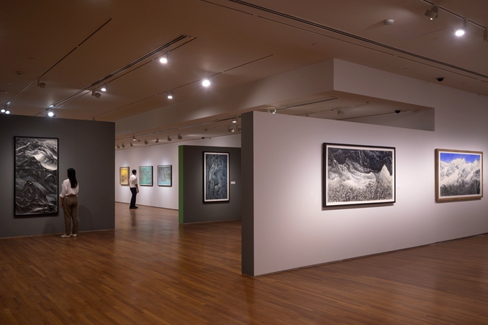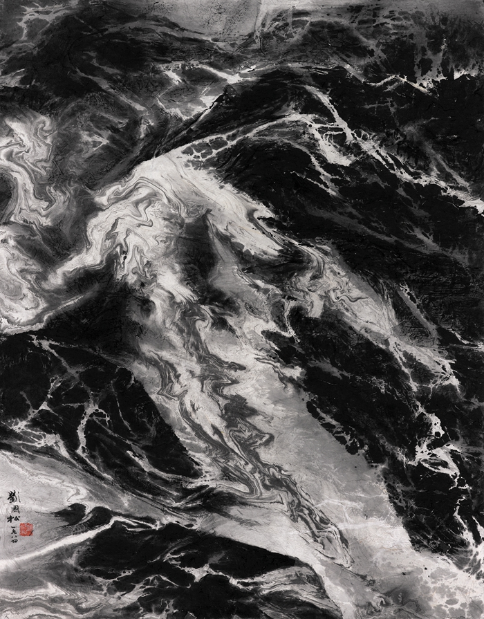1980年代开始,刘国松重返中国大陆各地游历。“水枕能令山俯仰”部分主要呈现了2000年之后,他以四川九寨沟和西藏雪山为题材进行的创作。2000年,刘国松应邀赴西藏大学讲学,他提出要去珠穆朗玛峰。当时刘国松注视着珠峰壮丽的风光,不知不觉过去了两个小时,全然忘记了高原环境的艰苦恶劣。下山之后,左耳突然失聪,至今未愈。2001年,刘国松被九寨沟绝美的水景深深打动,回到画室后多次实验表现的方法,最终发现了用建筑绘图用纸与宣纸结合,采取一种新的渍墨法,可以表现九寨沟水光交融、潋滟方晴的景色。在展览的最后版块,除了巨幅的雄伟雪山之外,不少大型作品正是刘国松对九寨沟水景的表现。