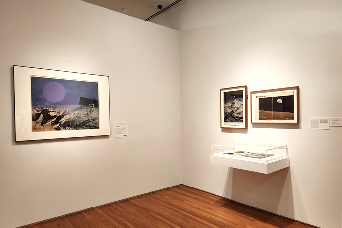 1960年代,刘国松受邀赴美旅行,此时也正值人类登月的年代。1968年12月,阿波罗八号环绕月球飞行时,第一次从月球拍摄下地球的照片。刘国松看到这张照片,感动不已。创作的名为《地球何许?》的作品获得当年美国“主流‘69”国际美展绘画首奖,刘国松的“太空画”系列就此诞生。这一板块中,陈列着1969年的《生活》杂志,旁边是刘国松从杂志上撕下阿姆斯特朗月球行走的照片拼贴创作而成的水墨作品《月球漫步》。也许当时人们没有意识到,这是一名东方人用水墨的方式对国际事件的一次历史性记录。