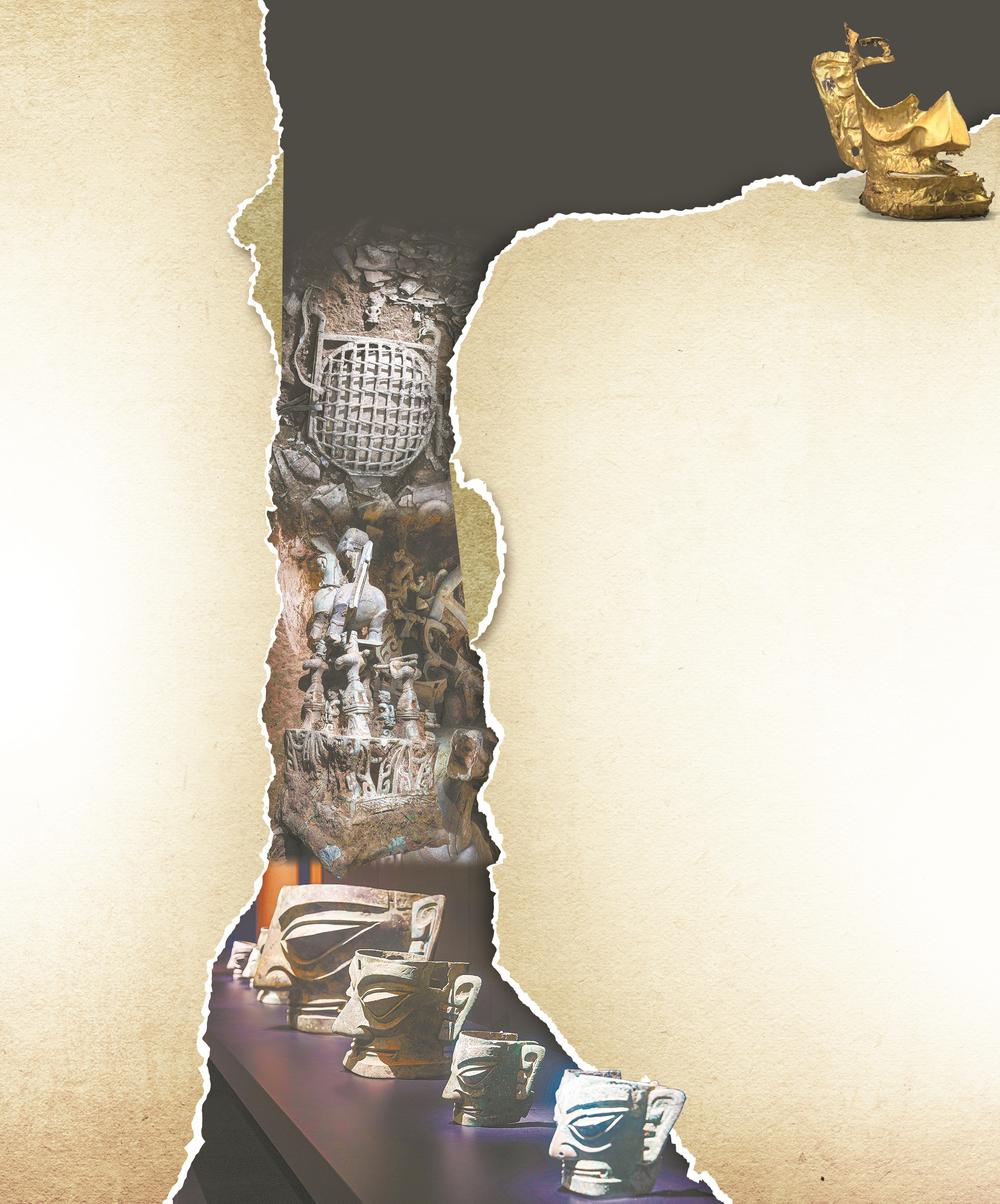 庄严肃穆的“抬杠”人像、形态各异的迷你铜人、精致工巧的镂空平台……在三星堆博物馆新馆第一、第三展区中,青铜神坛及其座上部件重新齐聚。三维投影分解呈现、3D打印拼合展示,新馆展陈运用不同的技术手段,在虚实结合间讲述着它“生长的故事”。这些部件,曾经散落在三星堆2、3、7、8号等多个祭祀坑中,单独看上去并不起眼,但如今经过组装,却成为一件尤为奇特的文物。