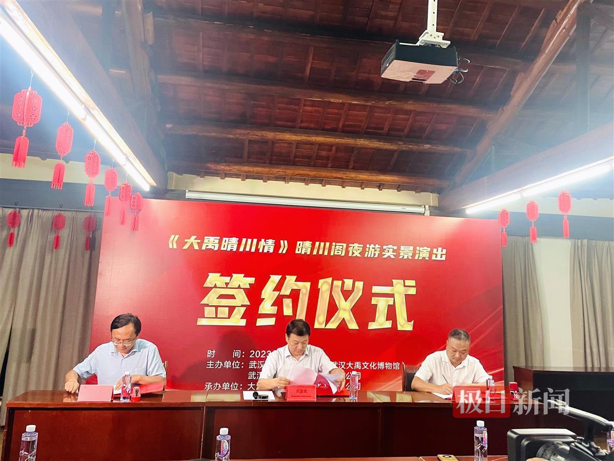 8月14日下午,《大禹晴川情》晴川阁夜游实景演出签约仪式举行。仪式上宣布,由武汉人民艺术剧院与晴川阁武汉大禹文化博物馆联合出品、武汉人民艺术剧院创作演出的文旅融合实景木偶剧《大禹晴川情》夜场将于9月震撼启幕,预计年演出160场左右。