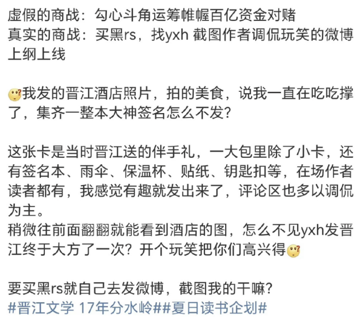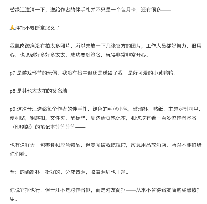 晋江文学城目前注册作者近260万人,作为这么庞大群体的代表,能参加作者大会,很多参会作者都很自豪,会自行发布微博,表达自己能参加作者大会的激动心情,表达对其他参会作者的喜欢,也表达对网站的认可,读者朋友们也都在评论群纷纷留言支持自己喜欢的作者,这本是再正常不过的个人分享,但偏偏有些营销号故意忽略作者之前微博发的大会酒店环境、美食、其他奖品,只断章取义的截图作者调侃玩笑的微博,让作者不得不专门再次发博澄清。