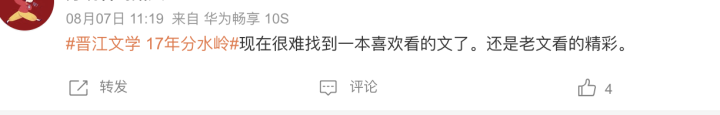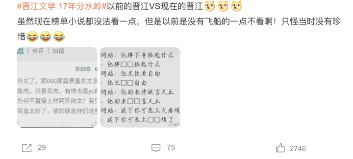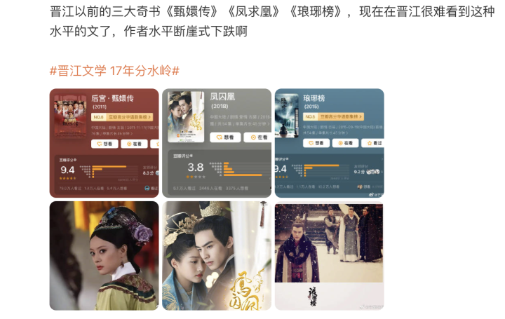 先是#晋江文学17年分水岭#上了热搜,相关话题中,有人说近两年晋江作者水平断崖式下跌,再也找不到《甄嬛传》《凤囚凰》《琅琊榜》这种水平的文了,还有人说这两年很难在晋江找到喜欢看的文,不得不把老文翻出来看。