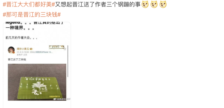 随后,在晋江文学城第五届作者大会举办期间,网站给作者赠送的价值3元包月卡又成了众矢之的,不少人紧抓着这件事不放,说晋江抠门,社交媒体上也悄然多了许多条带着#那可是晋江的三块钱#标签的调侃话。
