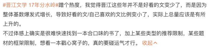 还有博主说,晋江这些年并不是好看的文变少了,而是因为整体基数爆发式增长,导致好看的文/自己喜欢的文比例变小了,实际上总量应该是有所上升的。