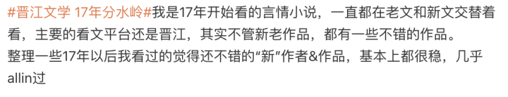 比如,一位17年后开始看言情小说的博主说,她一直是老文和新文交替着看,发现里面有不少很“稳”的作品,还把这些作品整理了下来,和网友一起分享。