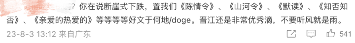 另一位读者摆出了《默读》《知否知否》《亲爱的热爱的》等作品,说晋江还是非常优秀的,希望大家不要听风就是雨。