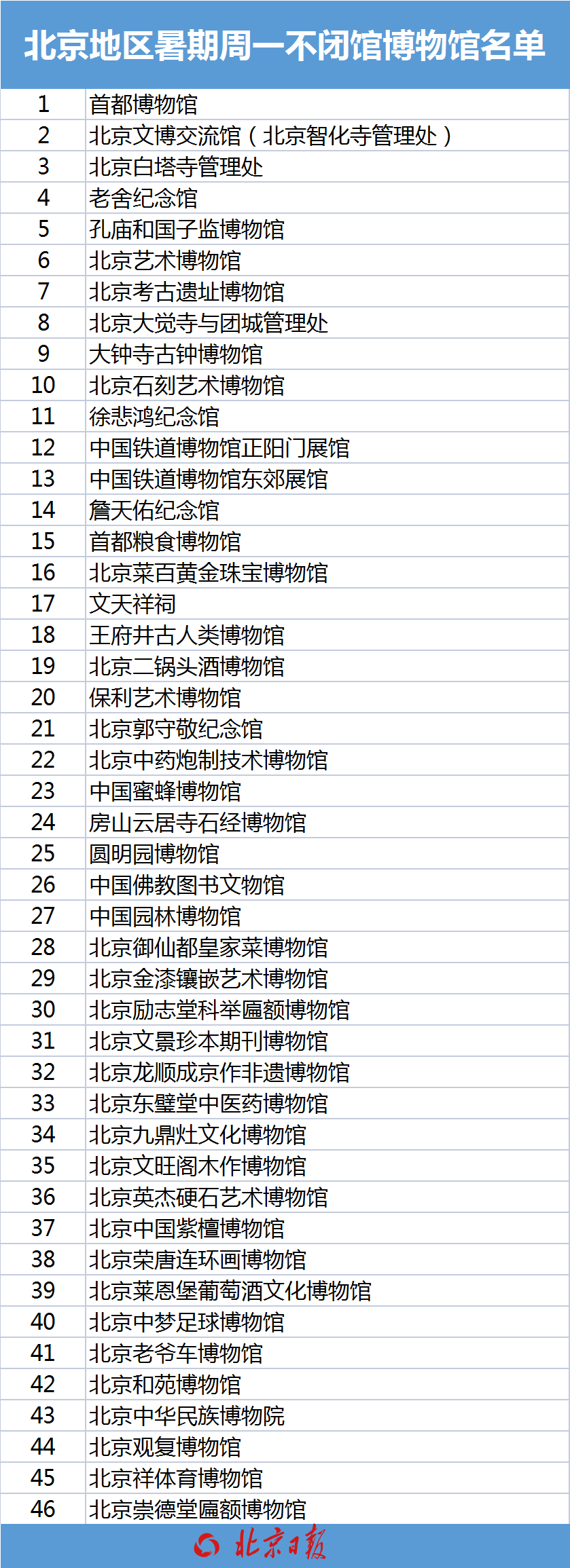 11家市文物局局属博物馆取消暑期周一闭馆政策,保证观众参观需求。包括:首都博物馆、北京白塔寺管理处、北京文博交流馆(北京智化寺管理处)、老舍纪念馆、孔庙和国子监博物馆、北京艺术博物馆、徐悲鸿纪念馆、大钟寺古钟博物馆、北京石刻艺术博物馆、北京考古遗址博物馆(金中都水关遗址)、北京大觉寺与团城管理处(包含大觉寺与团城演武厅)。