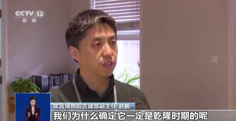 故宫博物院古建部副主任赵鹏:我们为什么确定它一定是乾隆时期的呢,因为它是在木板墙和地仗之间发现的,地仗我们能够判断是早期的,再加上上面裱糊的纸张,它的样式是明显的乾隆时期风格,那么我们可以非常笃定判断出来,这些残片是乾隆时期的东西,也是现在我们所知仅有的清中期烫样的一个构件。