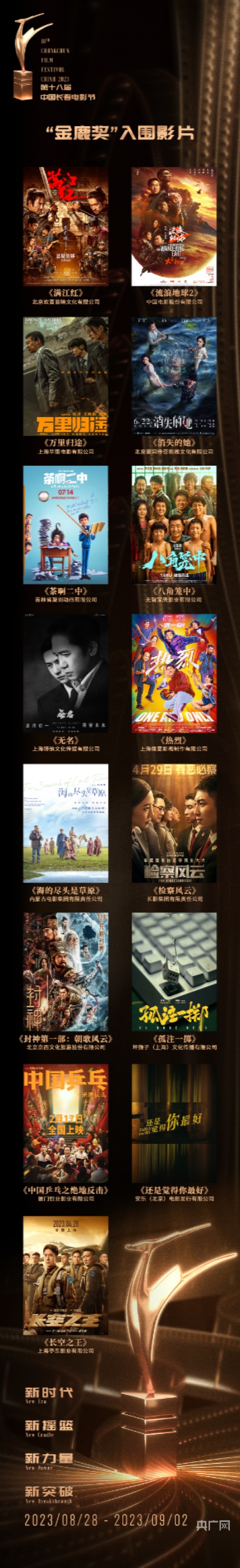 央广网长春8月21日消息(记者张学龙)长春电影节组委会今日对外公布了本届电影节“金鹿奖”入围影片,包括《满江红》《流浪地球2》《茶啊二中》等15部电影将进行最后的角逐。