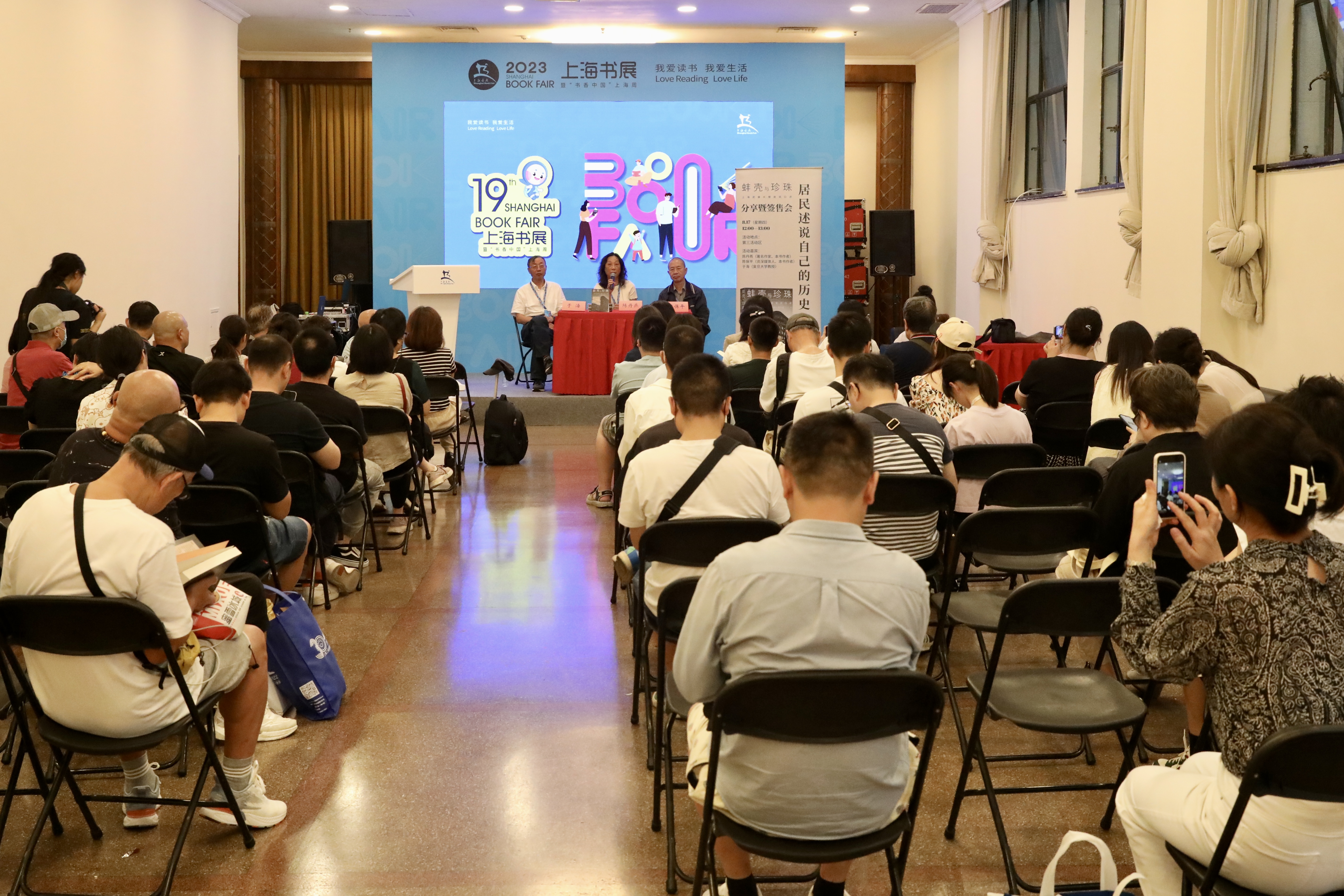 第三场活动,以“居民述说自己的历史——《蚌壳与珍珠:上海武康大楼居民口述》新书发布暨签售”为名,活动由复旦大学社会学教授于海主持,本书作者陈丹燕和陈保平对谈。