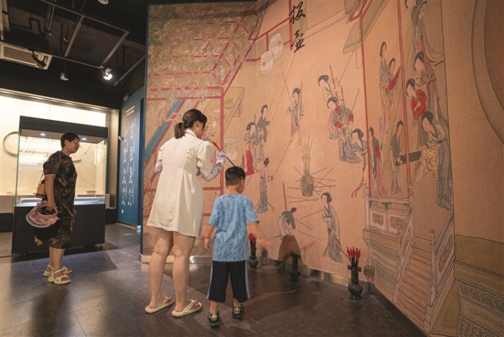 展览现场,最吸引眼球的莫过于以古代仕女们的投壶场景为背景的投壶体验点,路过的观众,时不时会卷起袖子试试手感。但也只有亲自上手,才能体验到这项古代运动的难度,因为壶口不大,其实普遍命中率并不高。