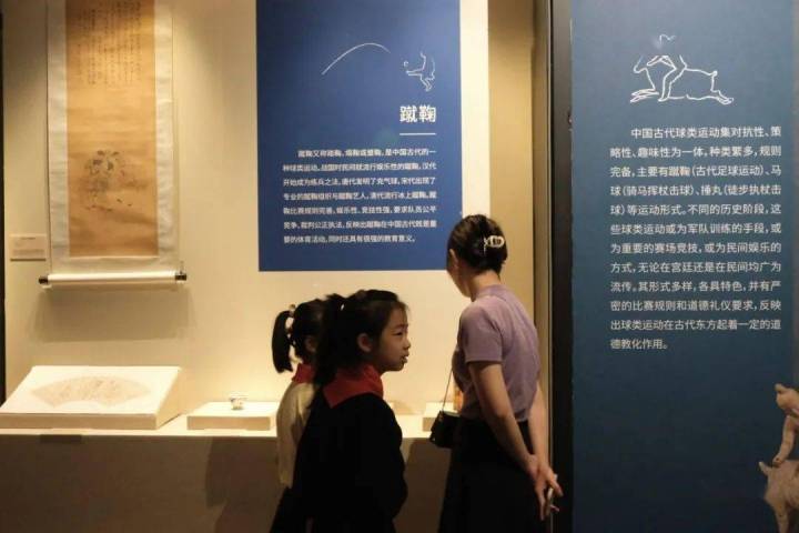 展览现场,观众通过清代画家顾洛所临摹的《宋太祖蹴鞠图》,还能沉浸式感受到这项运动在古代的受欢迎程度。画作中,宋太祖赵匡胤正在与一名对手PK,其他四人则在旁边看得津津有味。