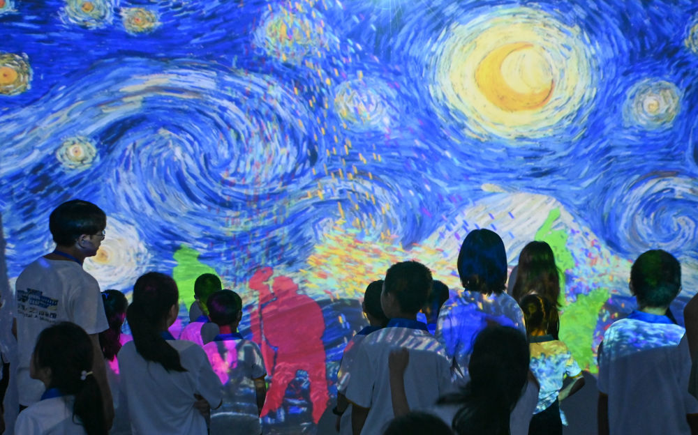 7月30日,在天津数字艺术博物馆,学生们沉浸式参观油画艺术作品。新华社记者 孙凡越 摄