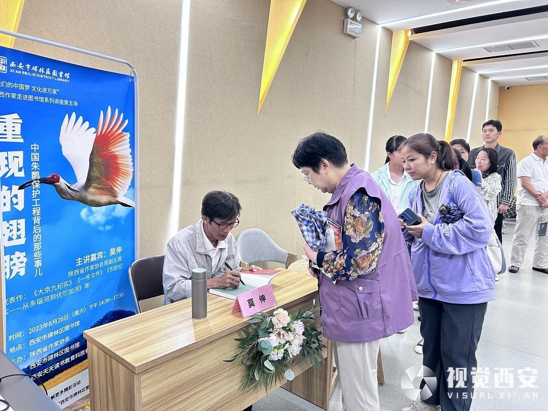 8月26日下午,陕西省作家协会和碑林区图书馆联合举办“我们的中国梦文化进万家——陕西作家走进图书馆”活动,作家莫伸为读者带来了“重现的翅膀——中国朱鹮保护工程背后的那些事儿”主题讲座。