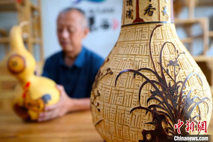 葫芦雕刻非遗传承人介绍自己的葫芦艺术品。张进刚摄