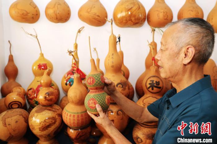 葫芦雕刻非遗传承人察看其作品。张进刚摄