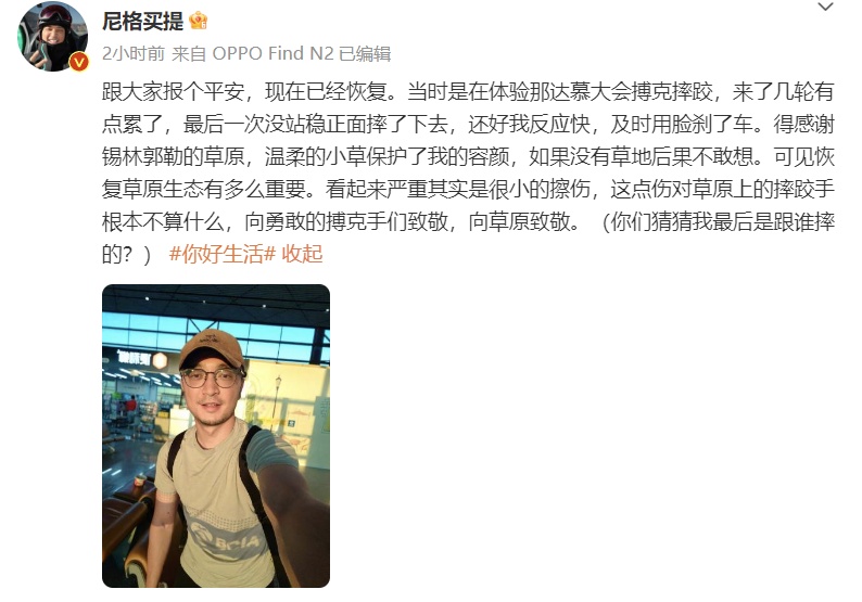 27日晚,尼格买提在微博上报平安,称现在已恢复,全文如下: