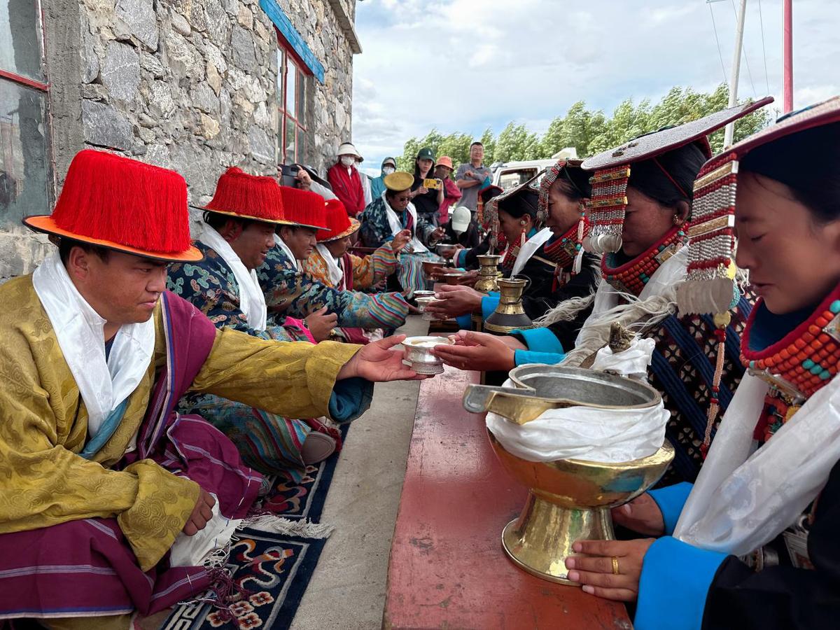 央子歌演唱者必须穿戴盛装,端起的酒杯口点有三点酥油,寓意着敬天、敬地、敬生灵。央子歌曲内容丰富,从歌词中不仅能够反映普兰悠久的历史,还能从中感受到敬酒妇女和饮酒男人们对美好生活的热爱和人与人之间相互尊重。