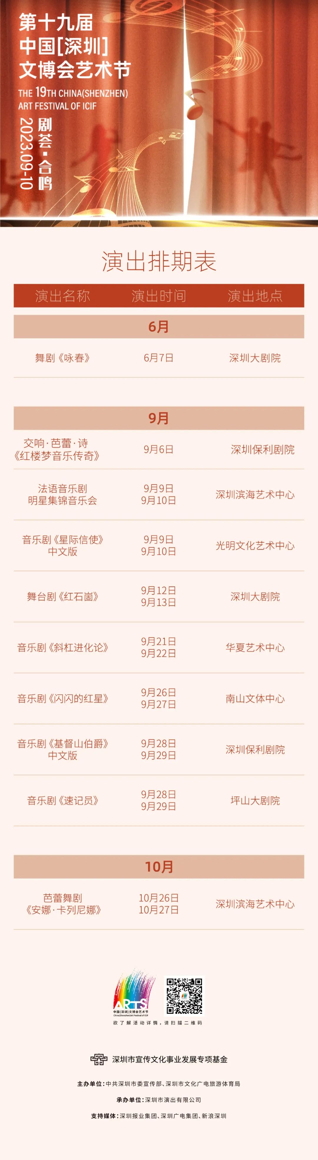 本届文博会艺术节主题为“剧荟·合鸣”,多个国内外一流艺术团体的艺术家们将献上10台18场舞台艺术精品展演、1场音乐剧大师班及多场周边活动,剧目涵盖音乐剧、舞剧、音乐会等多种表演形式,为广大市民群众提供丰富多彩、创意纷呈的艺术盛宴。