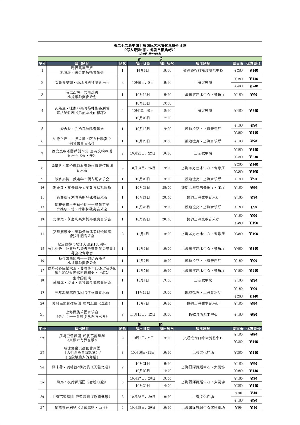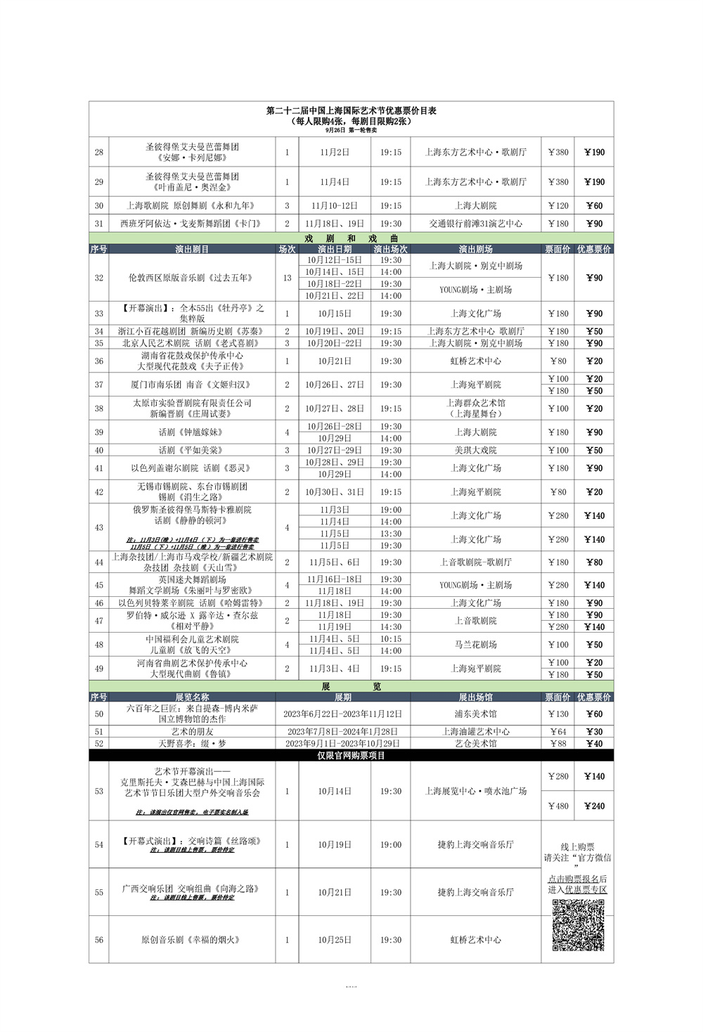 与规模体量同步提升的还有艺术节公共文化供给服务能力,本届艺术节优惠票将通过“线上+线下”双渠道同步公开发售。“中国上海国际艺术节”官网及微信公众号将开设线上优惠票选购板块。同时,首轮优惠票将在黄浦、闵行、浦东、长宁、徐汇五个区设立社区销售点,解决众多老年观众“买票难”问题,让优惠票真正做到打破“数字鸿沟”。后续,惠民票销售活动也将计划进入定点高校,面向学生观众,将“惠民便捷”的福利实实在在送达各年龄层的观众群体中,让广大爱艺人士有的选、有的看,并且能够提前安排时间、便捷轻松购票,实现“文化惠民、美美与共”。