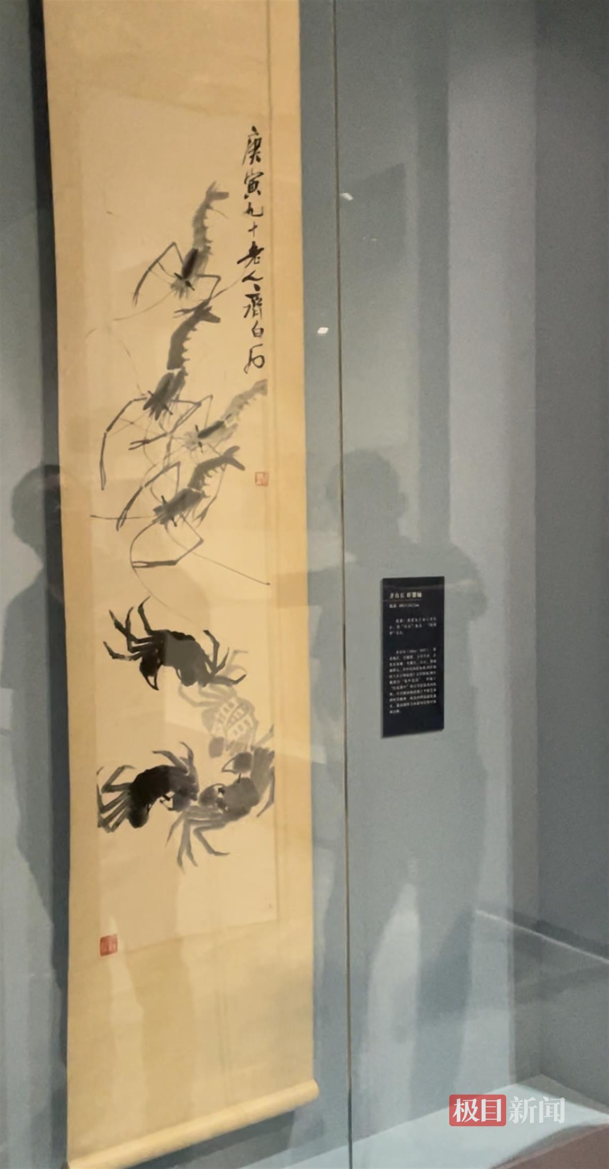 在为参观者介绍展览亮点时,王晓钟着重推荐了《虚谷花卉屏》《任薰人物屏》《齐白石虾蟹轴》等作品。他还带领观众仔细观摩《齐白石虾蟹轴》,感叹齐白石画花鸟草虫的功底深厚。