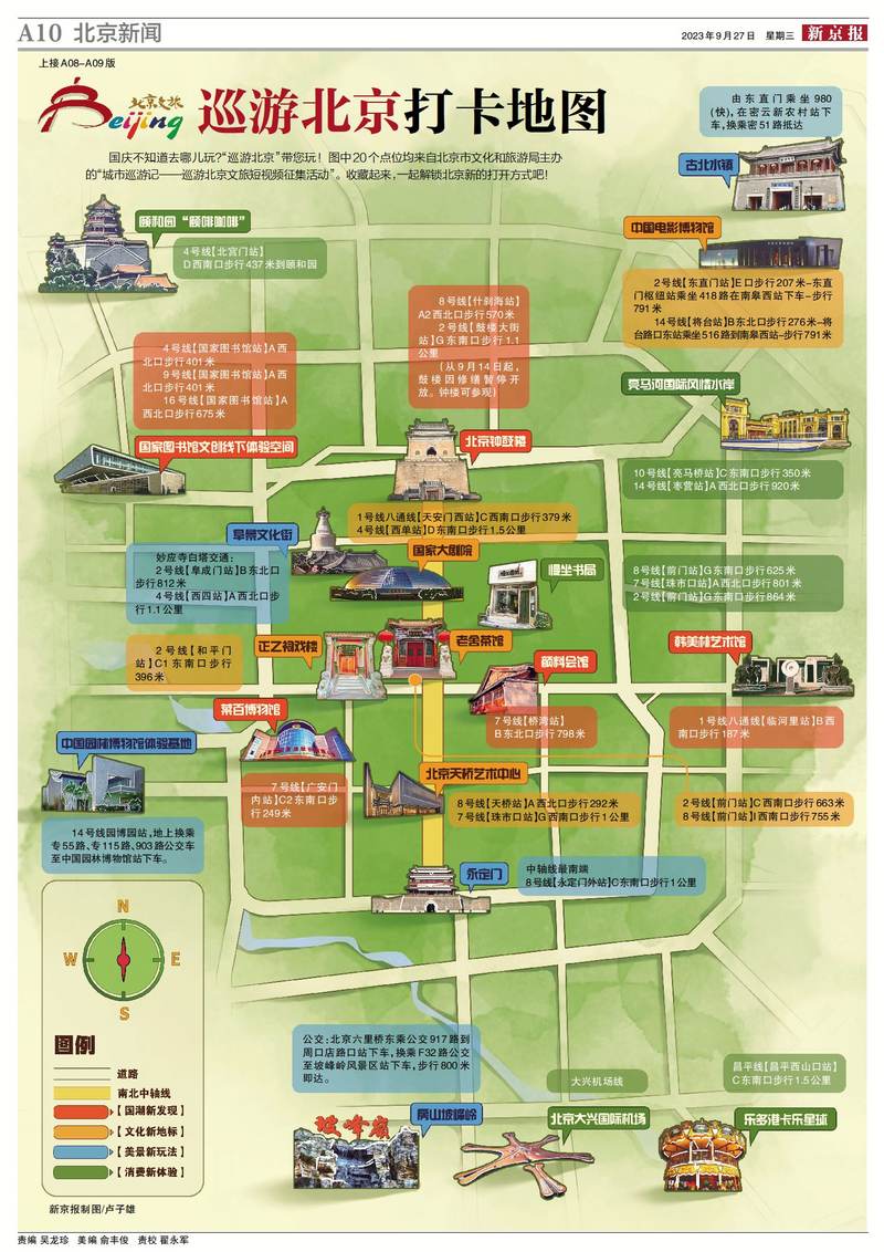 近些年,在很多旅游景点都能看到人们手捧“通关文牒”(手账本),在各处搜寻设计别致、反映景点特色印章的场景。在中国已有几干年历史的金石文化在今天有了新变种,各材质的印章、套色印章纷纷出现,丰富了大家的文化生活,记录下足迹抵达的地域,成为人们记忆的一部分。近日,由北京市文化和旅游局主办的“城市巡游记——巡游北京文旅短视频征集活动”评选出了20部获奖优秀短视频作品,里面涉及20个北京游玩点位,美景、国潮、演艺、新场景新业态等应有尽有,北京市文化和旅游局联合新京报将盖章文化与这20个点位相结合,制作出一份“盖章攻略”,希望大家在中秋、国庆到来之际玩得更尽兴。