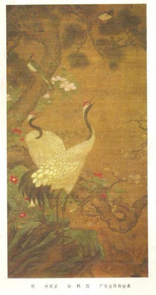 吕纪还有个外甥叫叶双石,他从小跟着吕纪学画,擅长山水。广东省博物馆藏有一张《松梅双鹤图》,其风格继承吕纪衣钵,以松梅鹤雀为题,款署“双石”二字。描绘细致精确,色彩富丽,法度谨严,从中亦可一窥吕纪绘画风采。