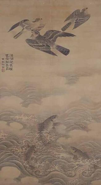 胡镇《跃鱼飞鸟图》及落款,京都国立博物馆藏。