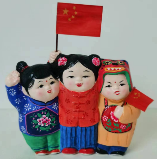 无锡惠山泥人始于宋,盛于清,苏东坡到无锡时曾有诗句“惠泉山下土如濡,阳羡溪头米胜珠”。传统惠山泥人彩塑技法,造型简炼,色彩明快。惠山泥人非遗传承人赵建高创作的《我爱我的祖国》展现了三个福娃在唱着“我和我的祖国”歌曲,洋溢着新时代气息,祝福祖国和谐美好、国泰民安。